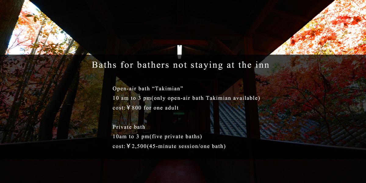 Guests can use the five private baths free of charge. All the baths offer a spacious feeling thanks to the semi-open construction facing a stream. Please tell us which bath you would like to use when you arrive.