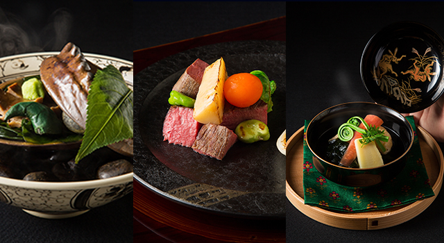 매월 메뉴가 바뀌는 대표 가이세키 코스 요리계절의 색채가 넘치는 전채요리로 시작해 신선한 생선회, 지역 브랜드 소고기로 만든 메인요리, 일본음식의 기본인 육수가 잘 우러난 국, 현지에서 재배한 쌀로 맛있게 막 지어 낸 밥, 디저트까지 모두 시간과 정성을 들여 손님들이 만족하실 수 있는 요리를 제공하고 있습니다.