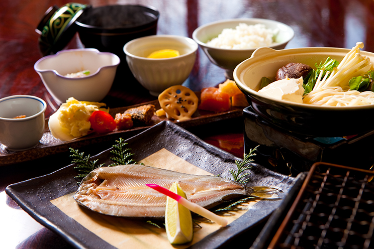 신선한 채소로 만든 샐러드, 수제 두부, 제철 생선 구이, 육수로 맛을 낸 달걀말이와 따뜻한 조림 요리, 수제 야채절임에 방금 지은 밥, 규슈 오구니 지역의 우유와 요구르트 등의 일본 요리를 기본으로 하면서 따뜻한 것과 찬 것의 균형이 잡힌 아침식사를 여유롭게 드실 수 있습니다.