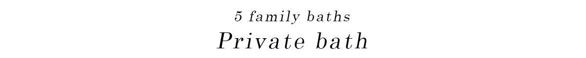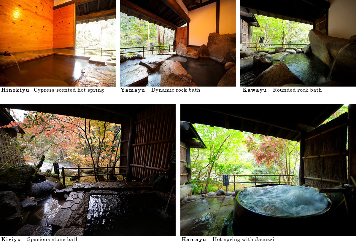 Guests can use the five private baths free of charge. All the baths offer a spacious feeling thanks to the semi-open construction facing a stream. Please tell us which bath you would like to use when you arrive.