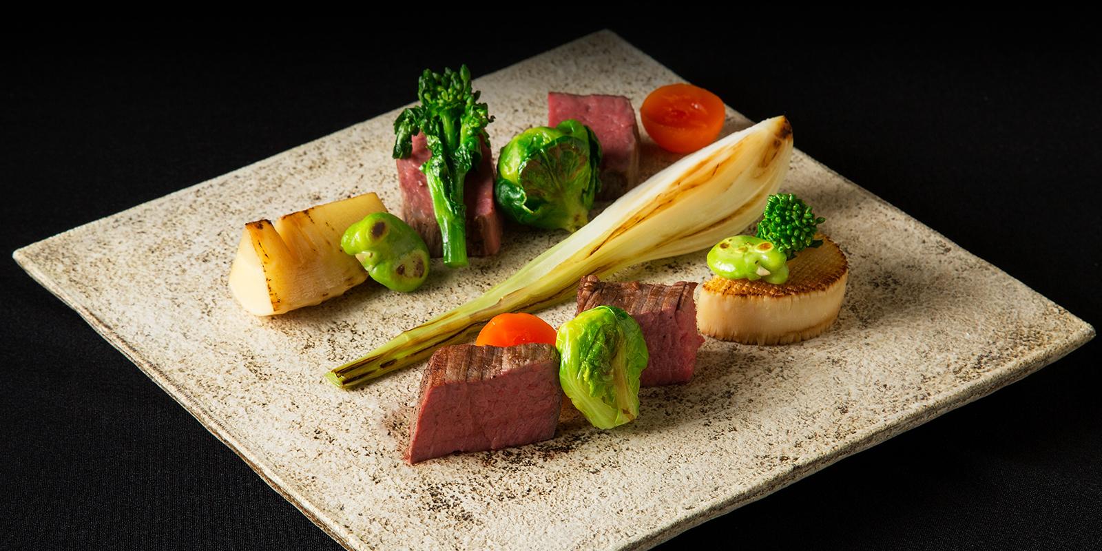 오이타 지역의 브랜드 소고기 분고규, 감칠맛이 응축된 오이타 칸무리 토종닭, 자연산 은어, 원목에서 키운 두꺼운 표고버섯 등의 식재료로 ‘본연의 맛’을 돋보이게 하는 조리법을 써서 손님들에게 정성껏 제공합니다.