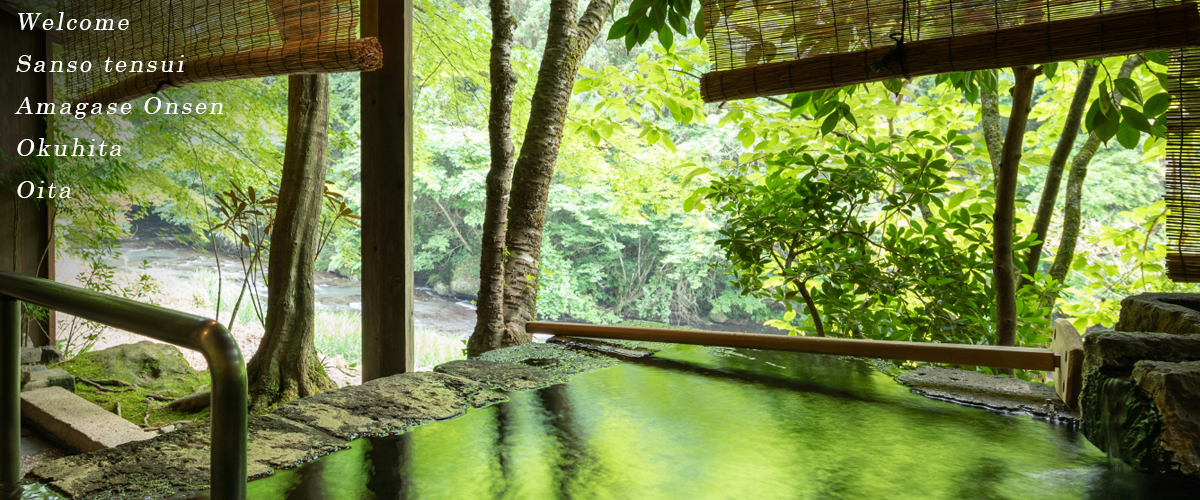 후쿠오카에서 자동차로 1시간 반 거리에 위치한 오이타현 아마가세 온천. 그 중심부에서 산간으로 조금 들어간 곳에 료칸 ‘산소텐스이’가 있습니다. 목조로 된 일본식 건축과 일본 본래의 분위기를 느낄 수 있는 운치 넘치는 조경이 이곳의 매력입니다. 아마가세의 명소 ‘사쿠라다키’폭포와 고라쿠가와 하천이 흐르는 쪽을 따라 세워진 본채, 노천탕, 전세탕, 운치 있는 일본식 객실이 있습니다. 2017년에는 넓은 테라스와 노천탕, 실내 욕탕이 딸린 특별실도 완성되었습니다. 프라이버시를 중시하는 공간에서 여유롭게 주변을 신경 쓰는 일 없이 온천과 식사를 마음껏 즐겨 주십시오.