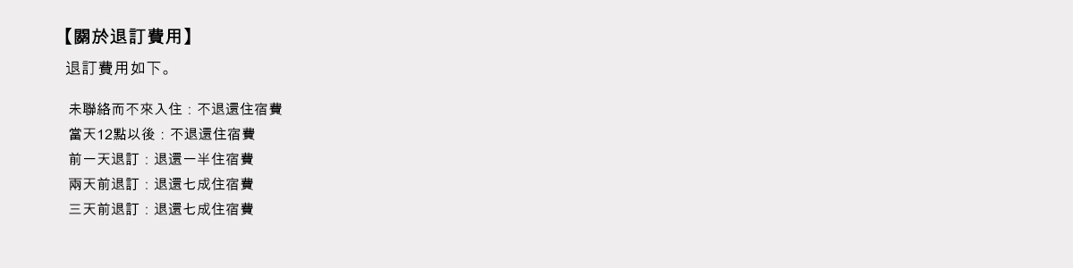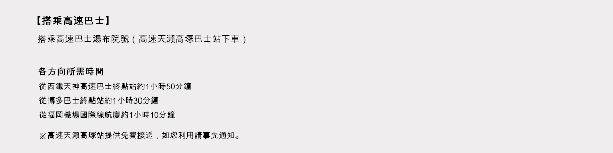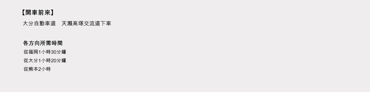 大分縣日田市天瀨町櫻竹601 郵遞區號879-4201 電話 0973-57-2424 傳真 0973-26-7822 入住 15:00~19:00 ※超過18點請聯絡我們。(晚餐最終開始時間19時) 退房11:00 總客房數19間